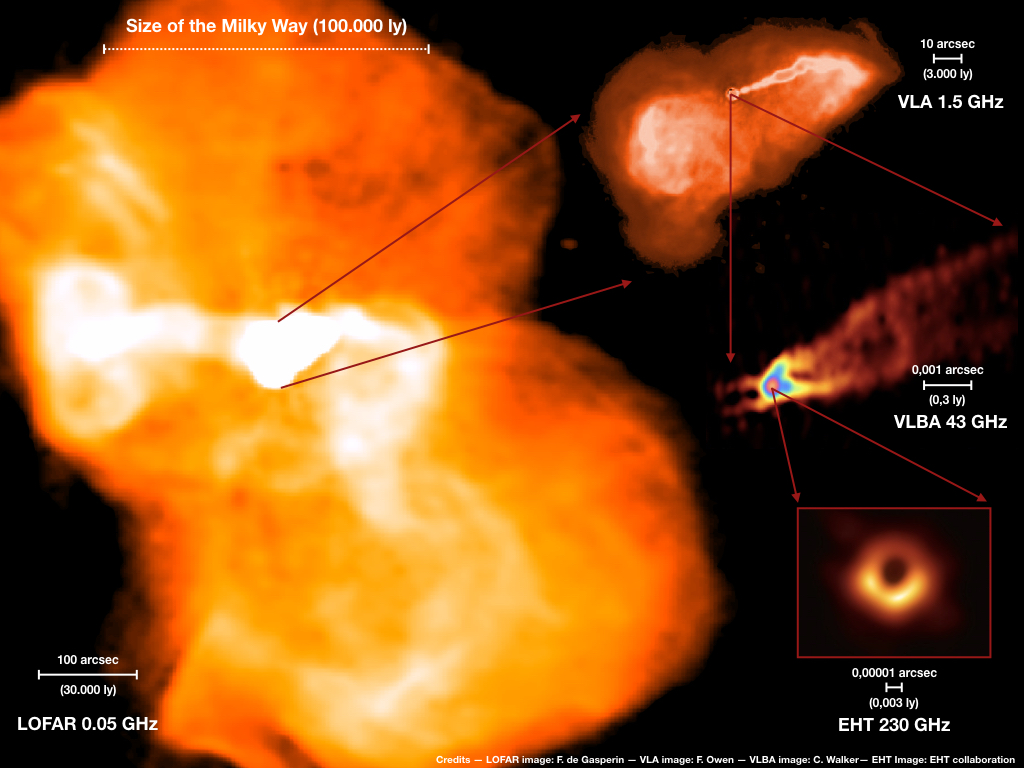 Hình 5c. M87 và vùng trung tâm ở các bước sóng radio và viba. Bên trái là ảnh từ đài thiên văn LOFAR ở bước sóng 6 mét. Hai vệch sáng trắng phun từ trung tâm ra hai phía, mỗi bên dài hơn 50.000 năm ánh sáng (tương đương với bán kính của Ngân hà chúng ta). Tâm của M87 là hố đen. Bên phải là phần trung tâm được phóng đại theo từng bước. Các ảnh vùng trung tâm từ đài thiên văn VLA (Very Large Array) và VLBA (Very Large Baseline Array) chụp ở bước sóng 20cm và 7mm. Hình góc bên phải cho thấy ảnh chân trời sự kiện của hố đen M87, chụp bởi EHT ở bước sóng 1.3mm (230 GHz). (https://www.glowconsortium.de/index.php/en/2015-04-29-07-49-43/blog-glow/172-m87-black-hole)