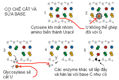 Muốn sửa lỗi này, ta cần cắt U và thay vào đó C. Đây cơ chế sửa lỗi có tên là cắt và sửa base (base excision repair).
