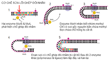 Có hai enzyme là MutS, MutL nhận dạng được sai hỏng ghép đôi. Còn có enzyme MutH nhận dạng được đoạn DNA nào không chứa methyl và việc cắt bỏ đoạn đó được thực hiện. Tiếp theo DNA polymerase sẽ tìm cách làm lấp đầy đoạn bị cắt và tiếp đến DNA ligase sẽ hàn lại.