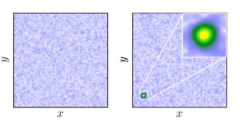 Bức ảnh bên trái miêu tả khoảng khắc ban đầu, khi khí được hòa trộn, bức ảnh bên phải miêu tả khoảng khắc ngay sau khi hình thành ngôi sao Bose. Màu sắc hiển thị mức độ đậm đặc: trắng-xanh da trời – xanh lá cây – vàng, từ thưa thớt đến dày đặc. Nguồn: nhóm tác giả công trình.