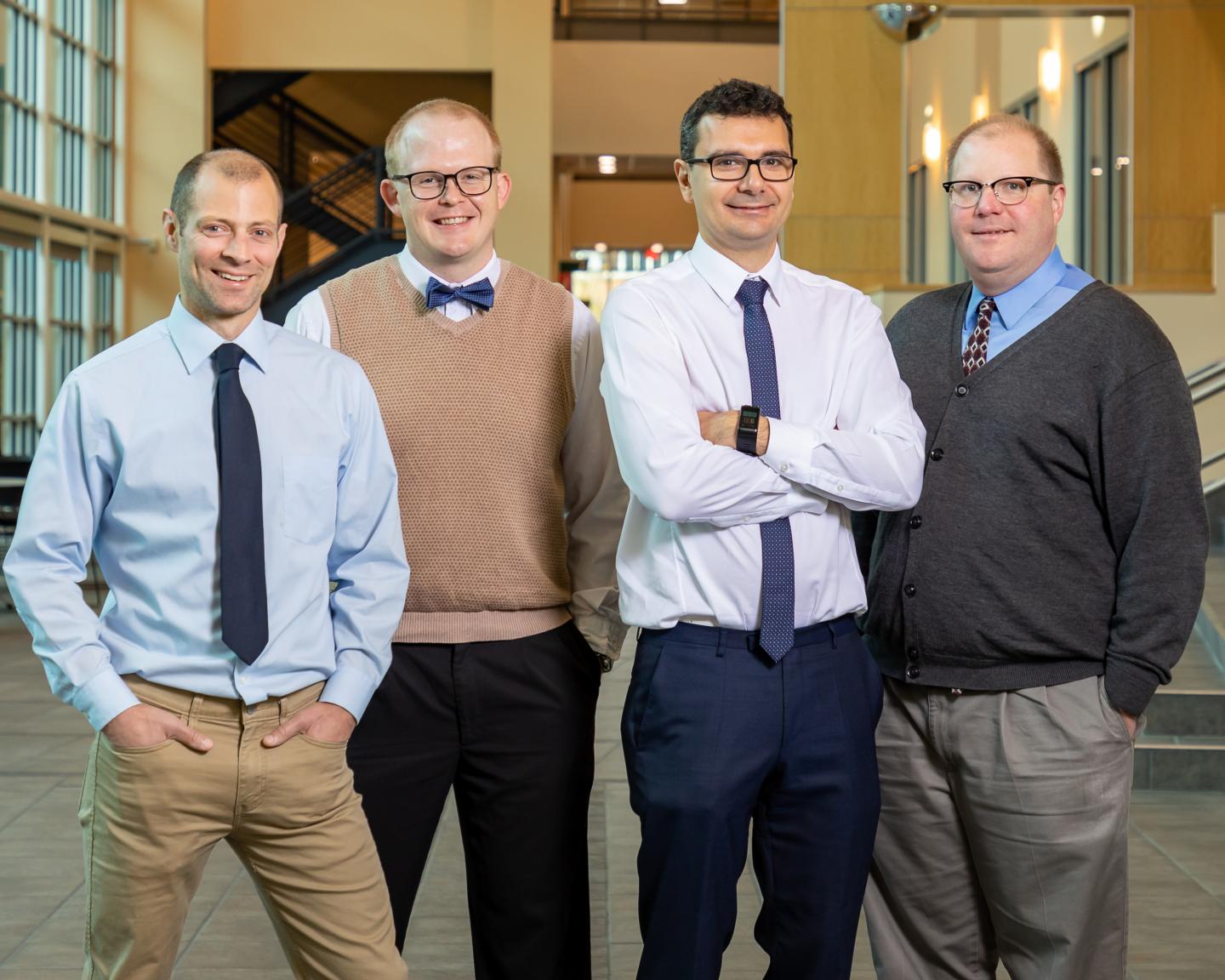 Brian Williams, Joseph Lukens, Pavel Lougovski, và Nicholas Peters (từ trái sang), cùng các nhà nghiên cứu thuộc nhóm Khoa học Thông tin Lượng tử thuộc ORNL đã thực hiện các tác động độc lập và riêng biệt đồng thời lên hai qubit được mã hóa bởi các photon có tần số khác nhau. Ảnh: Carlos Jones/Oak Ridge National Laboratory, US Department of Energy