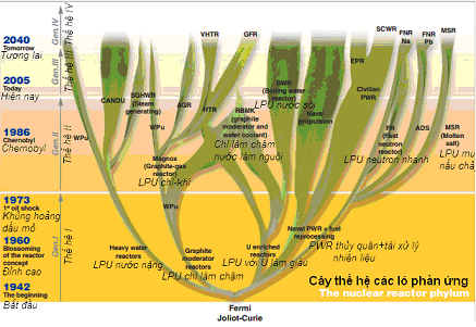 Hình 1 . Tại gốc ta có hai nhánh chính :các LPU sử dụng uranium thiên nhiên và uranium làm giàu. Sự phối hợp giữa hai nhánh LPU làm chậm bằng chì và tải nhiệt bằng khí mở đường cho các LPU nhiệt độ cao. Một vài nhánh đã « tuyệt chủng »: NUGG vì lý do kinh tế, RBMK vì lý do an toàn.
