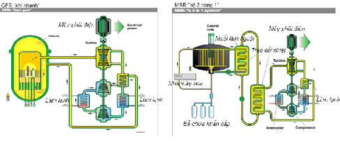 Hình 5. GFR là một hệ với LPU phổ nhanh (hình bên trái) và chu trình tái xử lý artinide. MSR là một hệ có neutron trên nhiệt (epithermal-0,02 đến 100 eV) sử dụng một loại dung dịch muối nấu chảy (UF trong muối) vừa làm nhiên liệu vừa làm chất làm nguội.Hệ GFR có chu trình nhiên liệu kín. Hệ MSR trong phương án MSFR cũng có chu trình nhiên liệu kín.