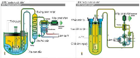 Hình 3. Hệ SFR gồm một LPU neutron nhanh (hình bên trái) kết hợp với một chu trình kín để tái xử lý các artinide và tái tạo plutonium.Hệ LFR cũng gồm một LPU neutron nhanh (hình bên phải) kết hợp với một chu trình nhiên liệu kín cho khả năng sử dụng tối ưu uranium
