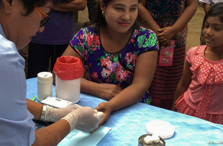 Một nhân viên y tế công cộng lấy mẫu máu của một phụ nữ để xét nghiệm bệnh sốt rét ở huyện Bo Rai, tỉnh Trat, Thái Lan. Ảnh: voanews