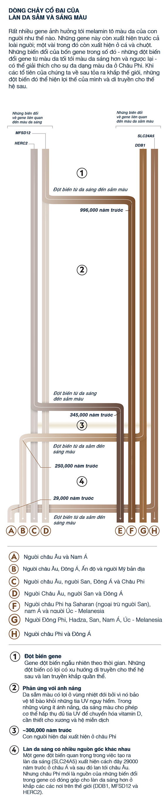 Gene của hai người bất kì nào, còn giống nhau hơn thế. Nhưng sau khi những tổ tiên tiền sử của chúng ta rụng phần lớn lông trên cơ thể, sự khác biệt dễ thấy nhất trong quá trình tiến hóa của chúng ta là màu da. Những tinh chỉnh rất nhỏ trong DNA của chúng ta là nguyên nhân của điều đó. Màu da tối giúp cho tổ tiên của chúng ta thích nghi với ánh nắng đổ lửa vùng châu Phi, trong khi với những người di cư khỏi châu Phi tới những vùng ít ánh nắng hơn, màu da sáng hơn trở thành lợi thế.