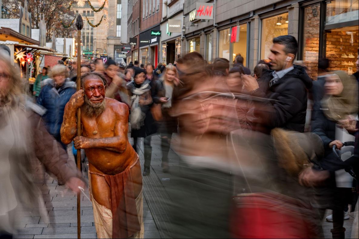 Ở Duseldorf, Đức, một bức tượng ở gần bảo tàng Neanderthal khiến cho những người đi qua tò mò và ngắm nghía. Một vài trong số những người đầu tiên rời châu Phi đã gặp và quan hệ với người Neanderthal. Kết quả của điều này đó là tất cả những người không ở châu Phi ngày nay đều có một phần nhỏ DNA của người Neanderthal. Những gene này có thể thúc đẩy hệ miễn dịch và mức độ hấp thụ vitamin D nhưng cũng có rủi ro dễ mắc bệnh tâm thần phân liệt – và bị béo bụng.