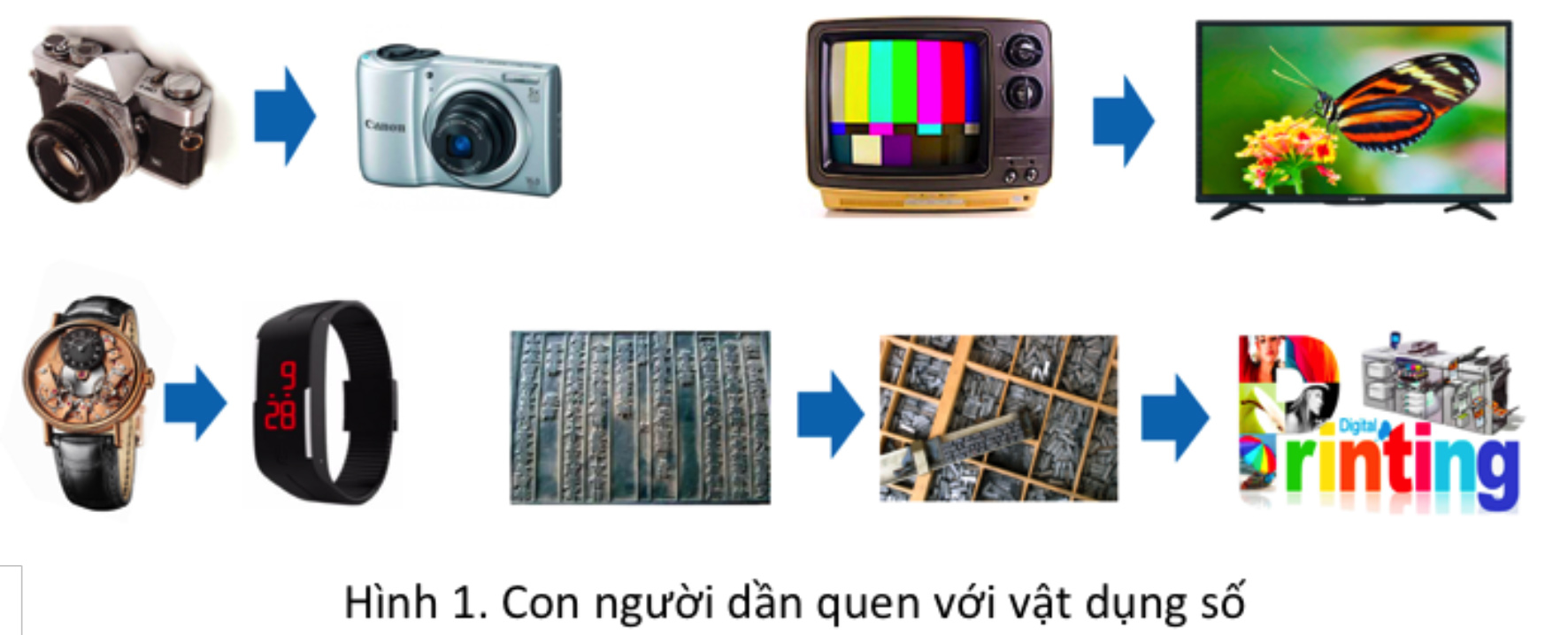 Từ khoảng hơn hai thập kỷ qua thành quả của nhiều công nghệ số đã dần đi vào cuộc sống của ta. Hình 1 chỉ ra một vài thí dụ: máy ảnh số hay điện thoại di động được dùng rộng rãi để chụp ảnh thay cho máy ảnh cơ; những chiếc Tivi với tín hiệu tương tự đang dần chuyển qua Tivi số với chất lượng màu sắc và độ nét cao hơn rất nhiều; những chiếc đồng hồ lên giây cót đang dần bị thay bằng đồng hồ số vừa xem giờ vừa có thể đo nhịp tim, đo số bước đi mỗi ngày; in ấn đã đi từ những bản khắc gỗ, đến xếp chữ chì, rồi đến in ấn điện tử… Hơn thế nữa, Internet và những chiếc điện thoại di động gần đây đã và đang thay đổi sâu sắc cuộc sống của ta, trong việc nhận và gửi tin tức, kết nối và liên lạc với người khác.