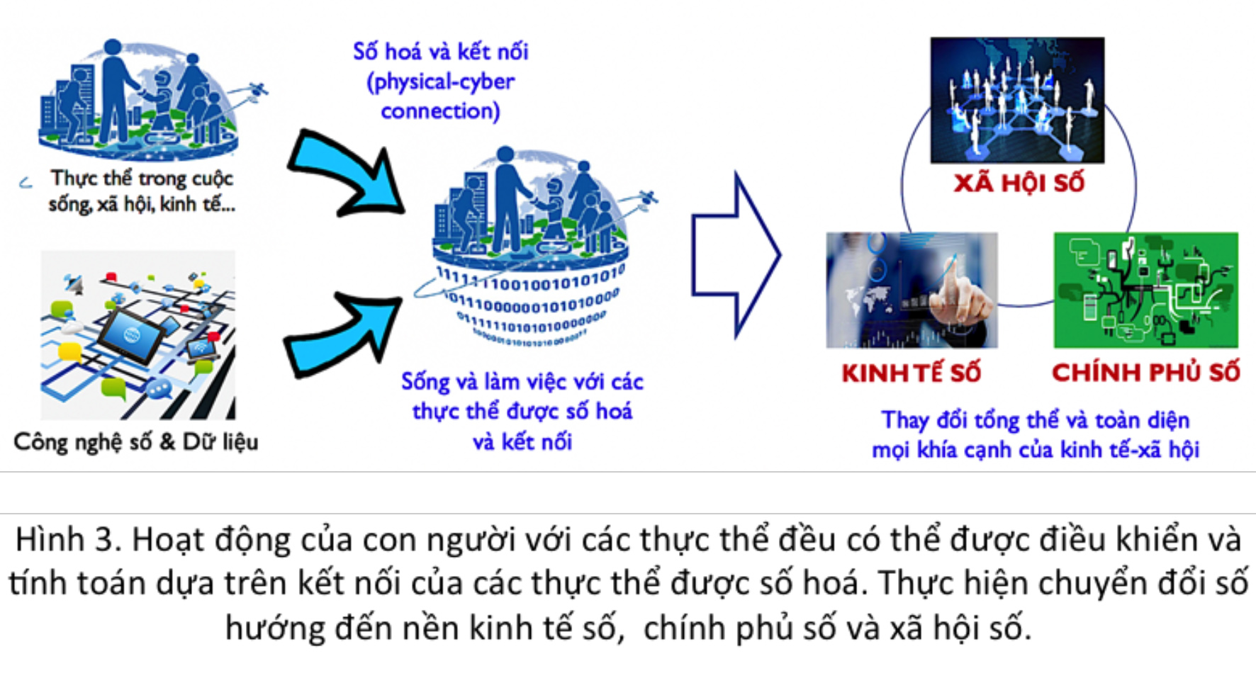 Chú ý rằng chuyển đổi số là sự thay đổi tất yếu của toàn xã hội, liên quan đến mọi người và mọi tổ chức. Dù ai muốn hay không chuyển đổi số cũng xảy ra. Đây là một cuộc thay đổi tổng thể và toàn diện mọi khía cạnh của kinh tế-xã hội, và Chương trình chuyển đổi số quốc gia nhằm đến ba mục tiêu liên quan chặt chẽ với nhau: kinh tế số, chính phủ số và xã hội số (Hình 3).