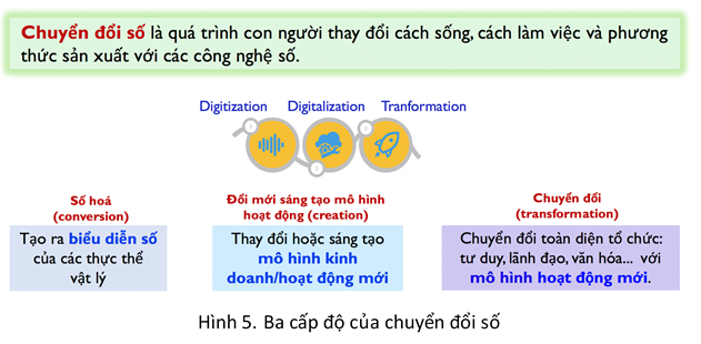 Chuyển đổi số là một quá trình lâu dài và phức tạp, và thường được nhìn theo ba cấp độ: (1) Số hoá; (2) Xác định mô hình hoạt động; (3) Chuyển đổi.