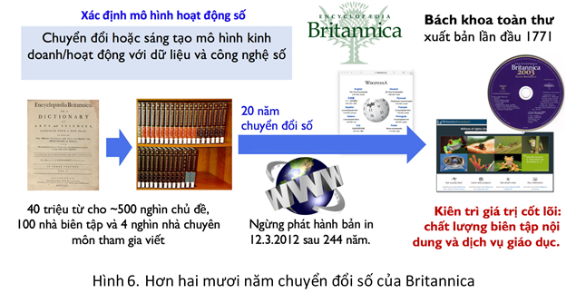 Hình 6 minh hoạ chuyển đổi số của Britannica, bộ Bách khoa toàn thư lâu đời và đồ sộ xuất bản lần đầu vào năm 1771, in thành 32 tập sách. Để không bị đánh gục trong kỷ nguyên số, Britannica đã chuyển đổi gian truân và mạnh mẽ trong hơn 20 năm. Ngày 12/3/2012 Britannica ngừng phát hành bản in sau 244 năm và chuyển qua các sản phẩm số. Nỗ lực đầu với phiên bản số trên CD-ROM của Britannica đã bị hạ gục bởi bách khoa toàn thư Encarta của Microsoft, cung cấp miễn phí cho khách hàng mua phần mềm Windows. Rồi khi các CD-ROM phải nhường chỗ cho Web, Britannica lại gặp cạnh tranh khốc liệt của các nguồn tin trực tuyến và miễn phí, gồm Nupedia rồi sau là Wikipedia.