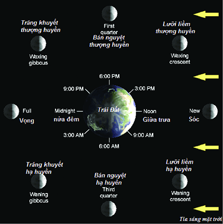 Sự phản chiếu của ánh sáng Mặt trời lên Mặt trăng cũng thay đổi theo từng thời kỳ, gọi là các pha của Mặt trăng (Hình 3).