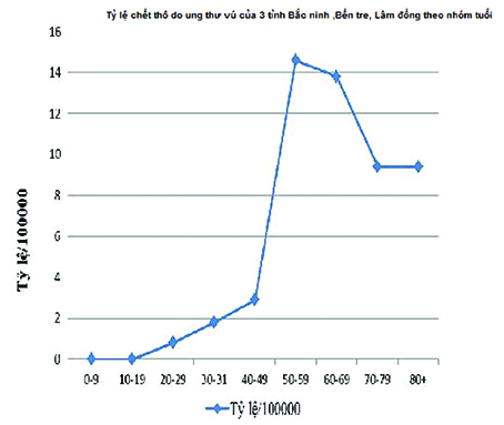 Ví dụ như biểu đồ Nghiên cứu tử vong do ung thư vú tại các tỉnh Bắc Ninh, Lâm Đồng, Bến Tre năm 20084. Ta thấy rõ tỷ lệ tử vong rất cao ở độ tuổi 50-60 là tuổi có biến dị lớn nhất.
