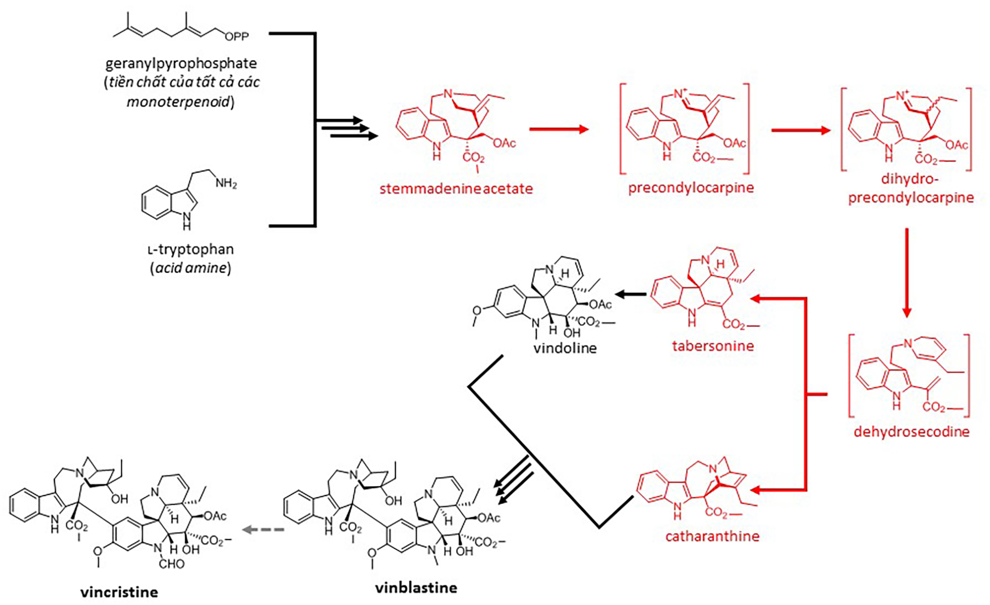 Tiền chất terpenoid ban đầu trải qua 31 phản ứng hóa học, trong đó có kết hợp với tryptophan (một loại acid amine), trong cây dừa cạn mới hình thành nên vinblastine (hình 2).