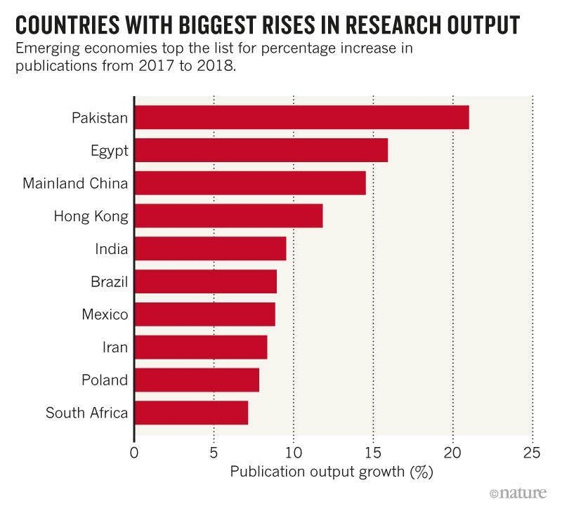 Theo ước tính của Clarivate Analytics – công ty hàng đầu thế giới về dữ liệu khoa học, các nền kinh tế mới nổi đã có bước tăng trưởng cao nhất về xuất bản công trình nghiên cứu trên các tạp chí quốc tế. Ai Cập và Pakistan dẫn đầu danh sách với mức 21% và 15,9%.