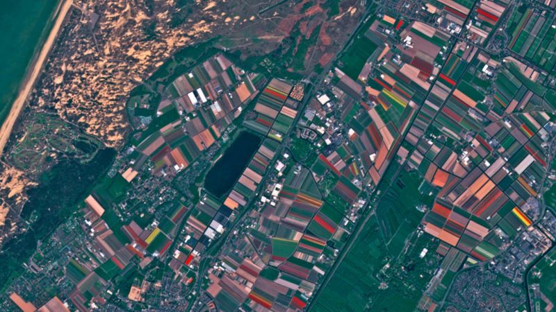 Những bức ảnh chụp từ vệ tinh của LiveEO cho thấy những cánh đồng trồng hoa tulip ở Bollenstreek đang nở rộ. Chúng ta cũng có thể bắt gặp cảnh tượng tương tự ở vùng Noordosstpoldern hay ở miền bắc Hà Lan – gần Alkmaar. Năm nay, khủng hoảng dịch bệnh đã làm lượng du khách sụt giảm trầm trọng, và tiếp đó là lệnh cấm đi lại khiến cho ngành du lịch gần như bị tê liệt hoàn toàn. Năm ngoái, cũng vào thời gian này, chỉ trong tám tuần, công viên hoa Keukenhof và các vùng trồng hoa ở Hà lan đón 1,5 triệu lượt du khách.