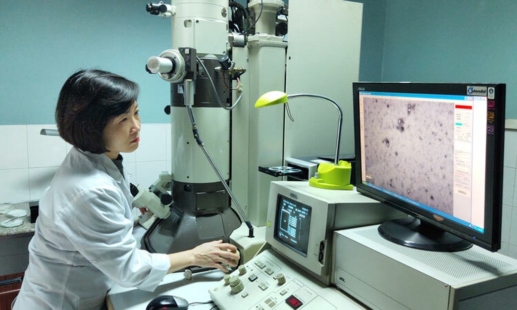 Nhà nghiên cứu Viện Vệ sinh dịch tễ Trung ương kiểm tra mẫu virus SARS-CoV 2 trên kinh hiển vi điện tử (TEM). Nguồn: NIHE