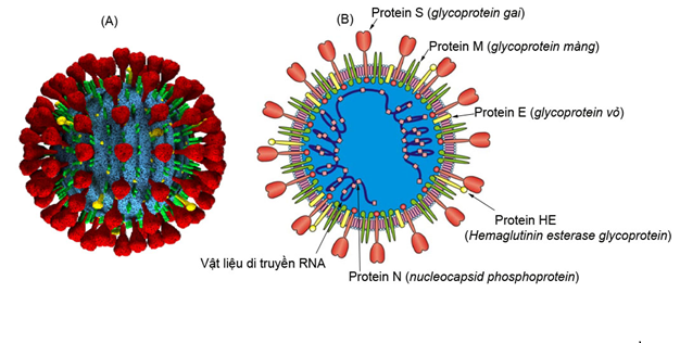 Hình 1: Mô hình 3D (A) và 2D (B) của vi rút SARS-CoV-2 [3]