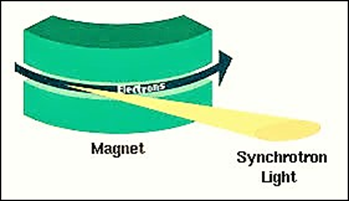 Hình 4: Bức xạ photon (từ vi sóng đến tia X năng lượng cao) được phát ra từ chùm electron được gia tốc theo hướng vuông góc với hướng từ trường trong máy gia tốc synchrotron. Bức xạ này còn được gọi là bức xạ từ hãm (magnetobremsstralung). Minh họa lấy từ Wikipedia.