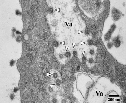 Hình 2: Hình ảnh hiển vi điện tử của vi rút SARS-CoV-2 chồi vào các khoang của tế bào (Va). Các đầu mũi tên trắng chỉ các hạt vi rút [2]