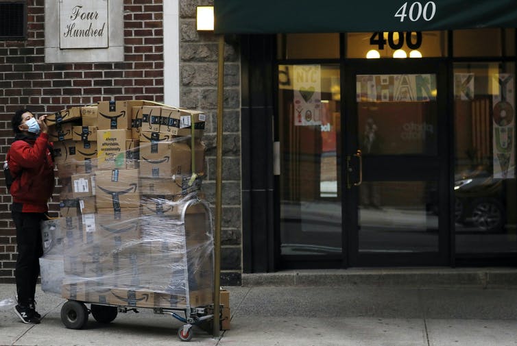 COVID-19 đã mang đến cho một số công ty những cơ hội lớn. Các tỷ phú ngày càng giàu hơn trong khi những người bình thường thì mất việc. Tài sản của Jeff Bezos, Giám đốc điều hành của Amazon, đã tăng thêm 25 tỷ USD kể từ đầu năm. Nhân viên vận chuyển của Amazon ở Manhattan, New York, April 29 2020. EPA-EFE/Peter Foley.