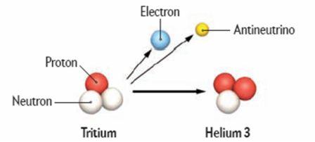 Hình 3. Các hạt nhân phóng xạ có phân rã beta: tritium (một đồng vị của hydrogen) phân rã thành helium 3, một neutron biến thành proton và một phản neutrino.