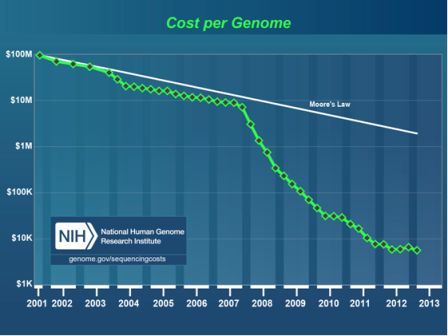 Giá cả giải mã toàn bộ bộ gene đã giảm xuống với kỷ lục này phá vỡ kỷ lục kia, hoàn toàn “phá vỡ” định luật Moore nổi tiếng về giá cả bộ vi xử lý sẽ giảm xuống ½ sau 18 tháng. Hình dưới cho thấy giá cả giải trình tự bộ gene hoàn chỉnh giảm hơn 10 lần chỉ sau một năm (2007-2008), và hiện nay 2013 giá này xuống dưới mức 10.000 USD.