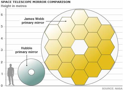 ![]() Tương quan kích thước giữa gương của JWST và gương của Hubble |