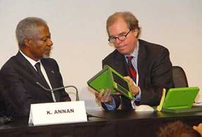 ![]() Nhà tài trợ Nicholas Negroponte và cựu tổng thư ký LHQ Kofi Annan: Loại Mini-Laptop sẽ giúp trẻ em bị thiệt thòi các nước thế giới thứ ba tiếp cận nhanh hơn với xã hội thông tin |