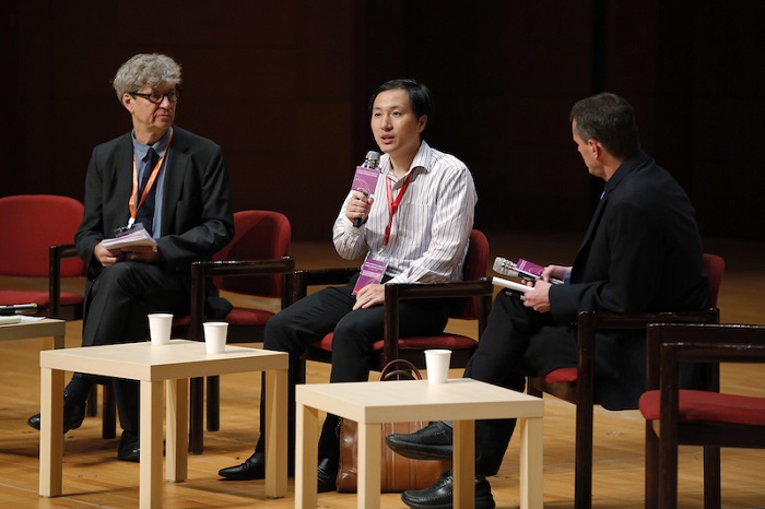 Hạ Kiến Khuê (giữa) đang trả lời các đồng nghiệp trong Hội nghị thượng đỉnh quốc tế lần thứ hai về chỉnh sửa bộ gene người tại Hồng Kông. Ảnh: Nature.