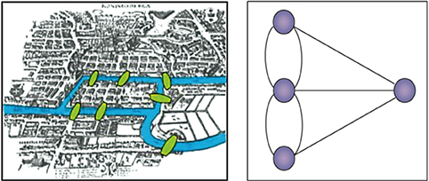 Con sông Pregel, chảy qua thành phố Phổ Königsberg, chia thành phố thành một hòn đảo và ba vùng đất riêng biệt, một ở phía Bắc, một ở phía Đông, và một ở phía Nam. Có tất cả bảy cây cầu, sắp xếp như trong bản đồ với các điểm màu xanh lá cây.