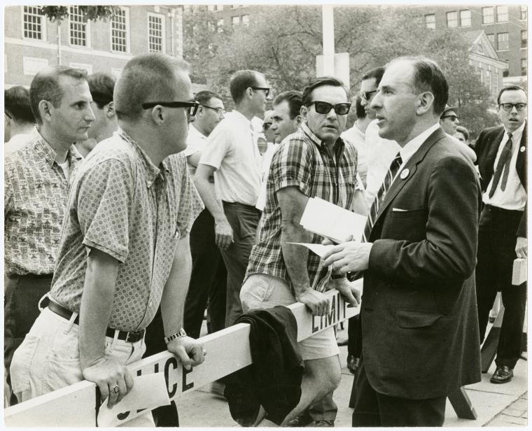 Kameny nói chuyện với người qua đường trước Tòa nhà Độc Lập ở Philadelphia vào ngày Quốc khánh Mỹ năm 1965. Ảnh: New York Public Library