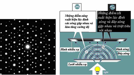 ![]() Hình1 . Bên trái: hình nhiễu xạ do Shechtman thu được. Bên phải: ánh sáng đi qua một lưới nhiễu xạ, các sóng hình thành giao thoa với nhau cho ta hình nhiễu xạ. |