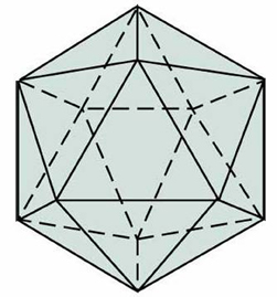 ![]() Hình 2 .Khối 20 mặt. Trong hình học khối 20 mặt là một khối đa diện đều với 20 mặt hình tam giác đều, 30 cạnh và 12 đỉnh. Khối này là một trong 5 khối rắn Plato. |