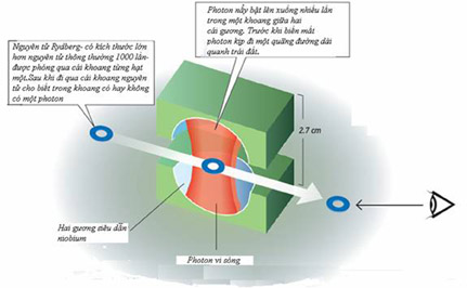 ![]() Hình 3. Giam giữ photon trong một khoang trống giữa hai gương siêu dẫn rồi nghiên cứu chúng nhờ những nguyên tử Rydberg. |