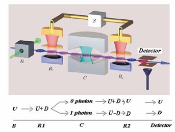 Một nguyên tử trong trạng thái U được chuẩn bị trong B.Trong R1 một xung laser tạo nên một chồng chất của các trạng thái U và D do đó hàm sóng sẽ là trạng thái chồng chất U+D.