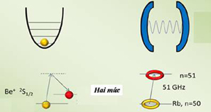 ![]() Hình 4. Bên trái ion Be+ nằm trong bẫy.Trạng thái lượng tử của nó (trạng thái trong và chuyển động) được điều khiển nhờ tương tác với những xung laser.Bên phải một photon (hoặc nhiều photon) bị bắt trong một khoang vi sóng tần số cao(high-Q microwave cavity). Trạng thái của trường được đo và điều khiển nhờ tương tác với các nguyên tử Rb. |