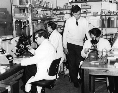 ![]() Robert Edwards trong phòng thí nghiệm cùng các đồng nghiệp tại Cambridge |