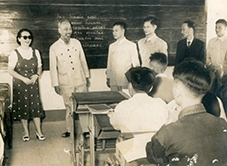 Chủ tịch Hồ Chí Minh đến thăm Đại học Y năm 1955, GS. Hồ Đắc Di (thứ hai từ phải sang), lúc đó à Hiệu trưởng.