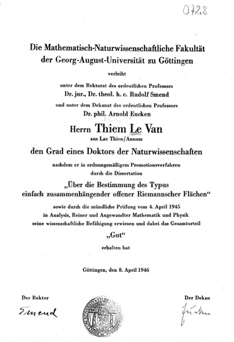 Sau khi trở về Đức, hai giáo sư Esnault và Viehweg đã sử dụng mọi quan hệ cá nhân cũng như uy tín của mình để tìm hiểu về GS Lê Văn Thiêm trong thời gian tại Đức. Sau nhiều cố gắng liên hệ với thư viện một số trường đại học của Đức, ngày 23/1/2009 họ đã nhận được Email của TS. U. Hunger từ phòng lưu trữ ĐHTH Göttingen với nội dung sau: Tôi có thể chứng thực rằng Thiem Le Van (hoặc Le Van Thiem) đã bảo vệ luận án Tiến sỹ ở đây (hồ sơ bảo vệ số Math.Nat.Prom. 0728). Tên của luận án là “Về việc xác định kiểu của một diện Riemann mở đơn liên”. Các môn thi nghiên cứu sinh (cùng với tên người chấm thi vấn đáp) bao gồm: Giải tích (Wittich), Đại số (Herglotz), Toán ứng dụng (Kaluza) và Vật lý thực nghiệm (Kopfermann). Phản biện chính của luận án, và cũng là thầy hướng dẫn, là Hans Wittich. Buổi bảo vệ được tổ chức vào ngày 4.4.1945, bằng Tiến sỹ được trao vào ngày 8.4.1946. Điểm đánh giá trung bình: giỏi.