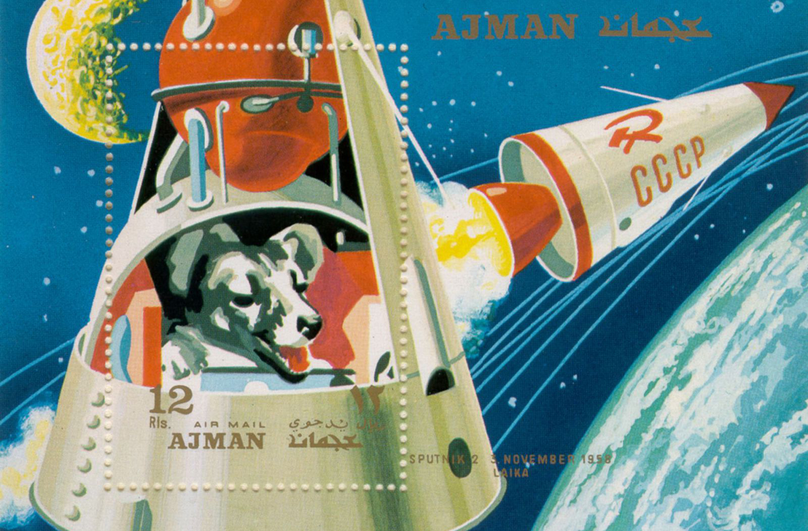 Ảnh chú chó Laika trên Sputnik 2 trên tem của Vương quốc Ajman, giờ là một phần của UAE. Ảnh: Smithsonian.org