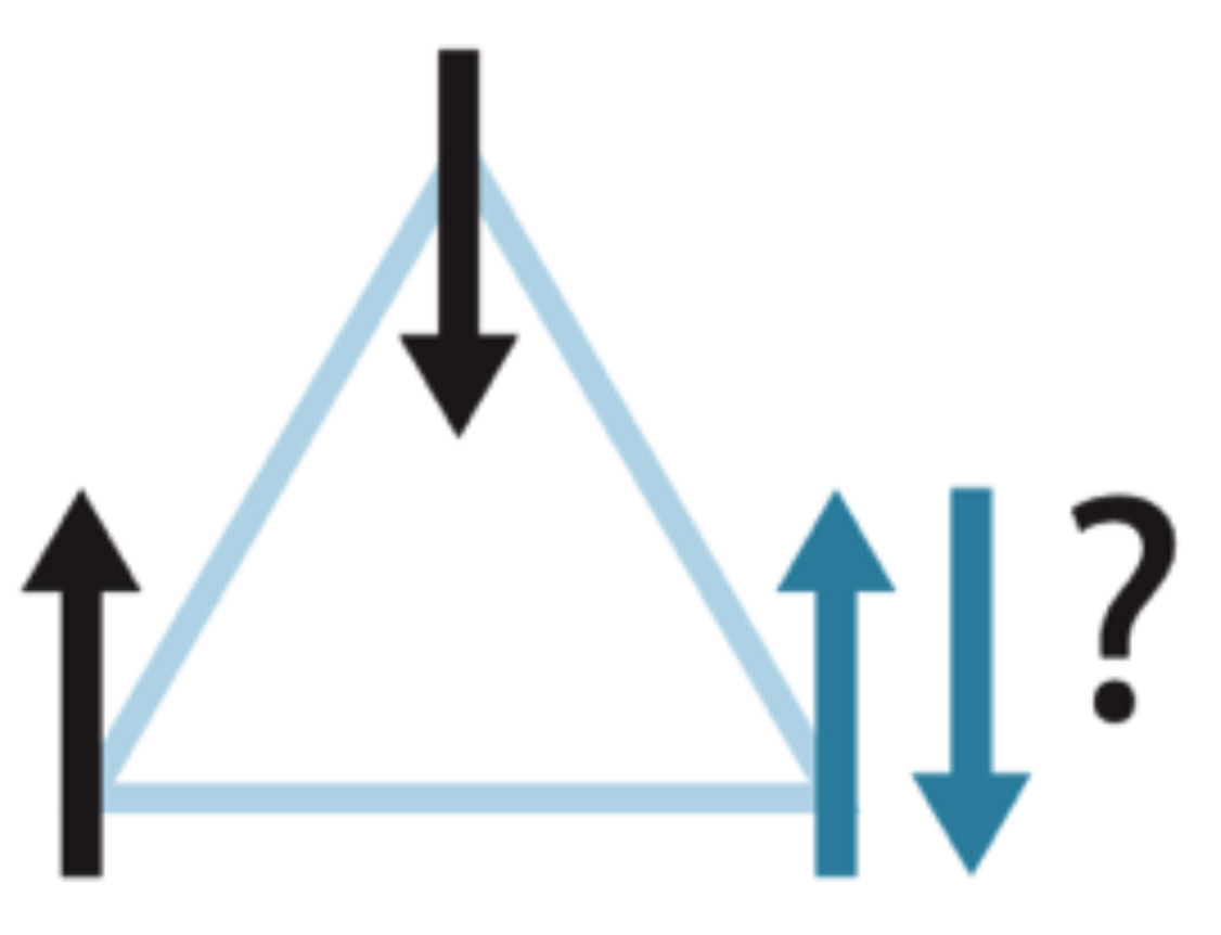 Hình 2: Sự rối loạn: khi một spin hướng lên và một spin hướng xuống thì một spin thứ 3 không thể thỏa mãn cả hai. Làm thế nào để tạo ra một sự cân bằng tối ư? GS. Parisi là bậc thầy của lời giải cho các hệ như vậy.