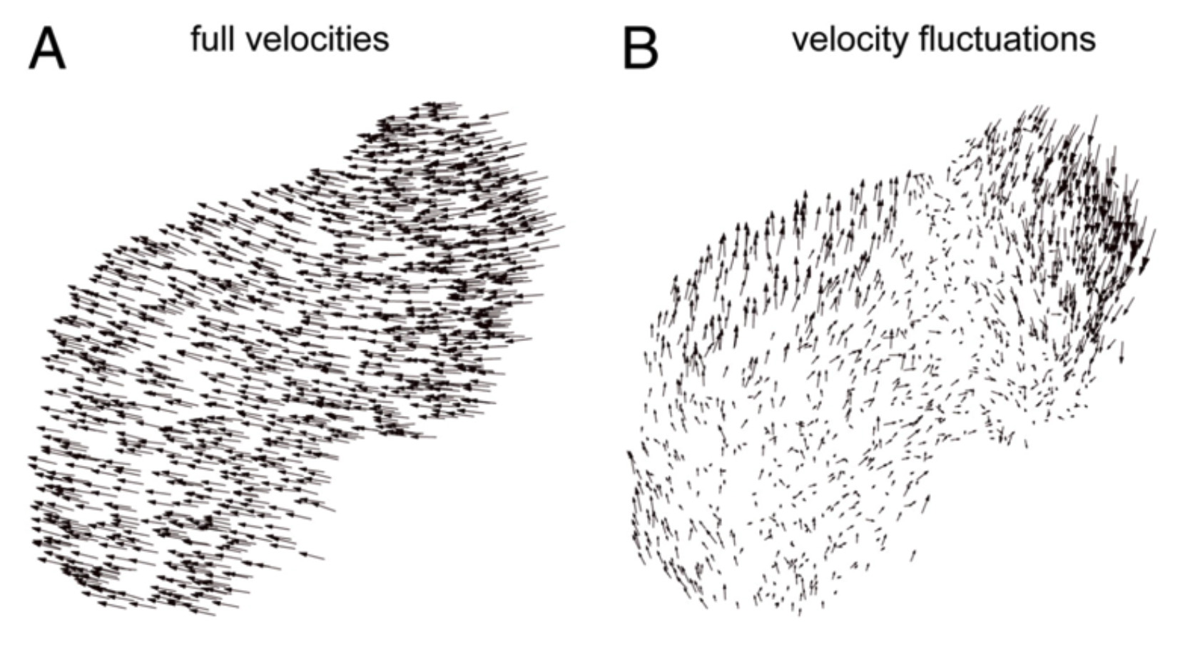 Hình 4: Hình chiếu 2D của vận tốc (A) và chênh lệch vận tốc so với vận tốc trung tâm (B) của một bầy chim sáo.