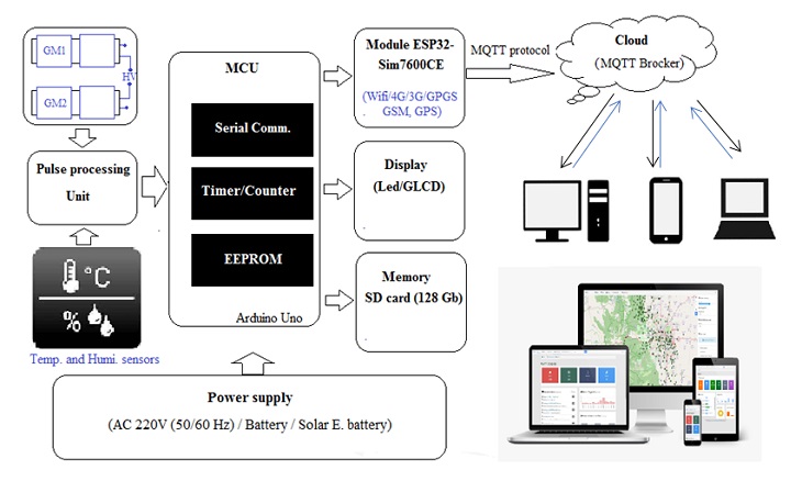 Hệ thống được xây dựng như sơ đồ khối với các thành phần chính bao gồm tổ hợp đầu dò bù trừ năng lượng Geiger-Muler (GM1 và GM2), dải đo rộng từ mức phông tự nhiên đến >1Sv/h; bộ vi xử lý 32-bit (MCU) cho việc đo đạc tín hiệu xung phóng xạ từ khối xử lý xung (Pulse processing unit), thực hiện giải thuật tính toán chuyển đổi tốc độ đếm sang tương đương liều môi trường H*(10). Bộ nguồn nuôi (Power supply) dựa trên nguồn điện 220V AC kết hợp vớipin năng lượng mặt trời và acqui dự phòng (12V-30Ah)giúp cho hệ thống có thể hoạt động liên tục ngoài trời. Các số liệu được đo đạc theo thời gian thực và lưu trữ trong thể nhớ SD card và hiển thị trên màn hình LED hoặc tinh thể lỏng (Display-LED/GLCD). Hệ thống sử dụng công nghệ IoT trong việc truyền dữ liệu tới trung tâm điều hành trên máy chủ đám mây (Cloud) thông qua mạng GSM, wifi/4G/3G/GPRS. Người dùng có thể truy nhập, điều khiển hệ thống thông qua nền tảng web với bất kỳ một thiết bị thông minh nào như máy tính, tablet, điện thoại di động có kết nối internet.