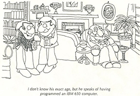 Cái máy tính đầu tiên mà tôi được sử dụng là máy IBM 650. Nhiệm vụ của tôi là tính tích phân phương trình vi phân mô tả sự lan truyền sóng âm trong nước khi biết phân bố nhiệt độ theo chiều sâu. Khi đó chưa có transitor, một linh kiện có trong hầu hết các thiết bị điện tử; chiếc máy IBM này sử dụng những ống chân không và có kích thước lớn bằng cỡ hai phòng làm việc của nhóm nghiên cứu hiện nay của chúng tôi. Trái tim của chiếc máy là một cái trống từ quay, với bộ nhớ được sắp đặt trên 40 bộ phát hình trụ, mỗi bộ nhớ có dung lượng 50 word (đơn vị dữ liệu, độ lớn của 1 word thường bằng bội số 8 của bit). Hai hàng cố định 50 bộ nhớ được đặt đối mặt với trống từ, một hàng để đọc và hàng còn lại để viết lên trống. Để làm phép cộng đơn hai số, a và b, với nhau, chúng ta phải viết ba lệnh. Mỗi lệnh bắt đầu với một số để nhận dạng, thường được cho theo thứ tự, và thường được kết thúc bằng một số nhận dạng khác để dịch sau đó. Lệnh đầu tiên yêu cầu lấy số a từ bộ nhớ trống từ m1, ghi số này vào bộ cộng. Lệnh thứ hai yêu cầu nhận số b từ bộ nhớ trống từ m2 và ghi số này vào ô nhớ thứ hai của bộ cộng. Lệnh thứ ba yêu cầu lấy kết quả của phép cộng từ bộ cộng và ghi vào trống từ vào bộ nhớ m3. Dữ liệu đầu vào và ra được viết trên những thẻ đục lỗ, chúng tôi là những người làm việc đó; để thu được số liệu ra trên giấy, chúng tôi phải xử lý các tập thẻ trên một cái máy in lớn vừa chậm vừa ồn với tốc độ in khoảng một dòng trên một giây.