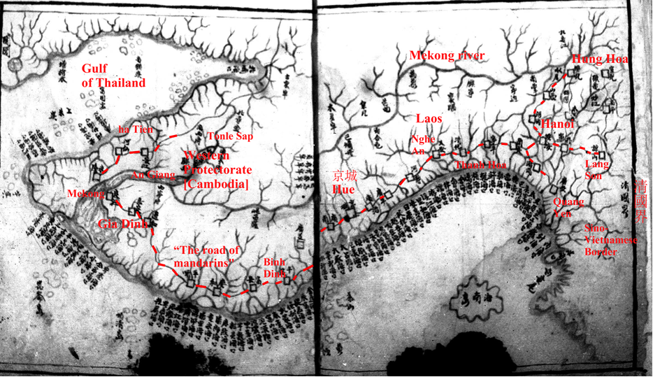 Đại Nam toàn đồ gồm 32 tỉnh và 62 cửa biển (khoảng những năm 1830). Đường dịch trạm được tô đỏ. Nguồn bản đồ: Đại Nam toàn đồ (EFEO Microfilm).