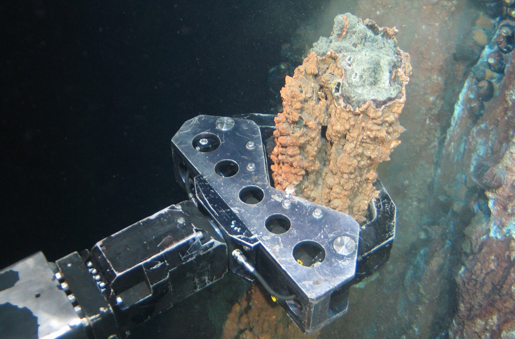 Một cánh tay robot đang lấy mẫu đá giàu khoáng sản ở sâu dưới lòng đại dương, khu vực biển Papua New Guinea. Nguồn ảnh: Nautilus Minerals.