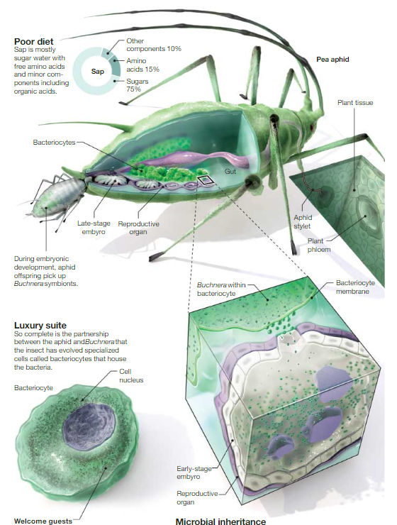 Rệp cây ăn nhựa hút từ phloem, hệ tuần hoàn của cây, nhưng chế độ ăn này thiếu nhiều dưỡng chất quan trọng. Chúng cần Buchnera, một vi khuẩn sống bên trong cơ thể chúng, giúp biến các a-xít a-min trong nhựa cây, chẳng hạn glutamate, thành những a-xít a-min bị thiếu. Ngược lại, vi khuẩn Buchnera được hưởng những dưỡng chất khác và sự che chở bên trong con rệp cây. Nguồn: Bickel, Science.