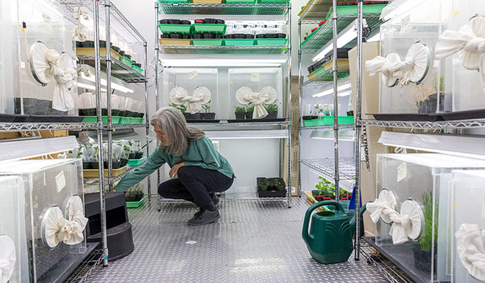 Một căn phòng đầy những cây lúc nhúc rệp đủ cung cấp cho các thí nghiệm của Nancy Moran và nhóm của mình. Ảnh: JULIA ROBINSON