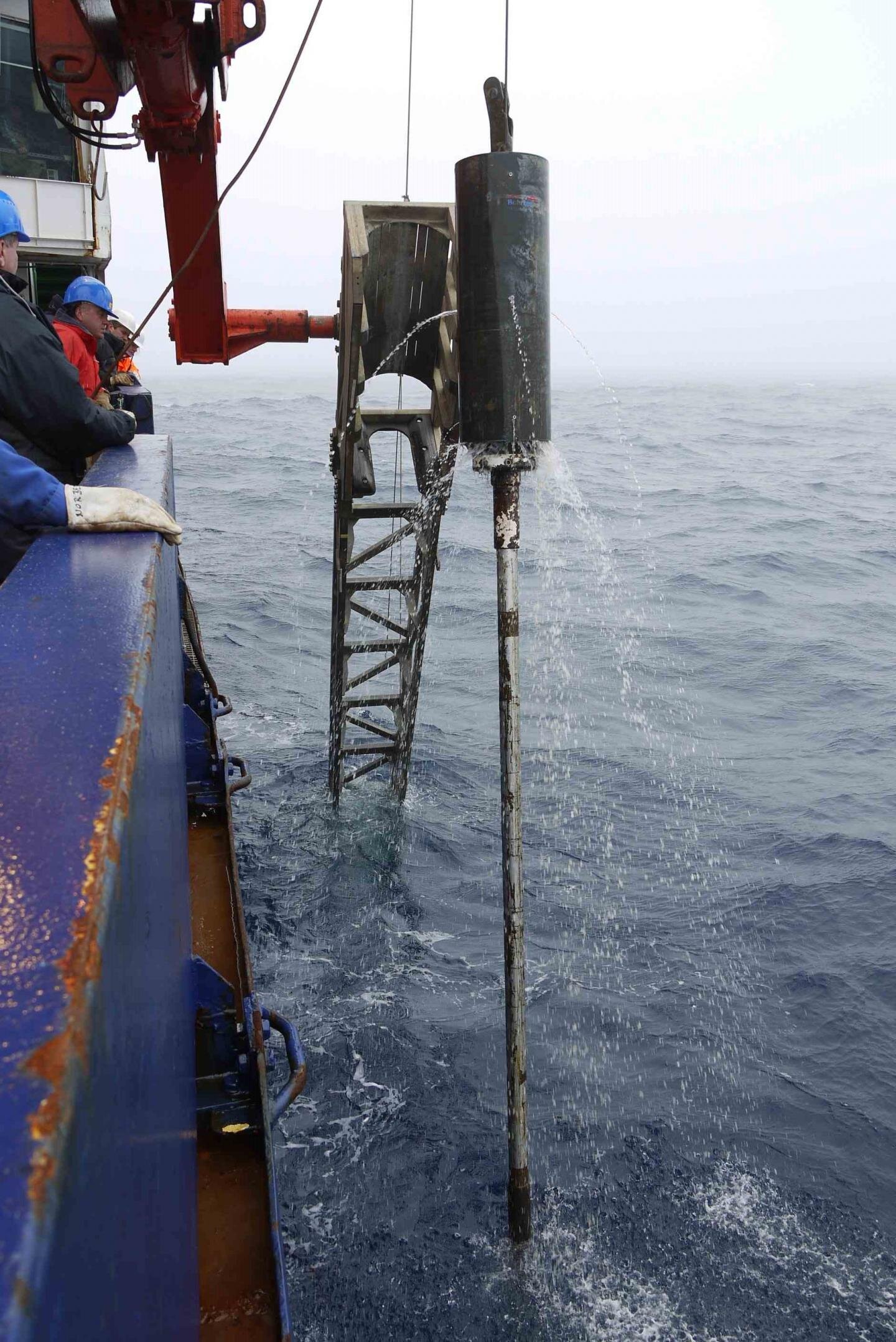 18 lõi trầm tích từ đáy biển được đưa lên tàu nghiên cứu Polastern bằng pit tông và máy dò trọng lực. Nguồn: Phys.org